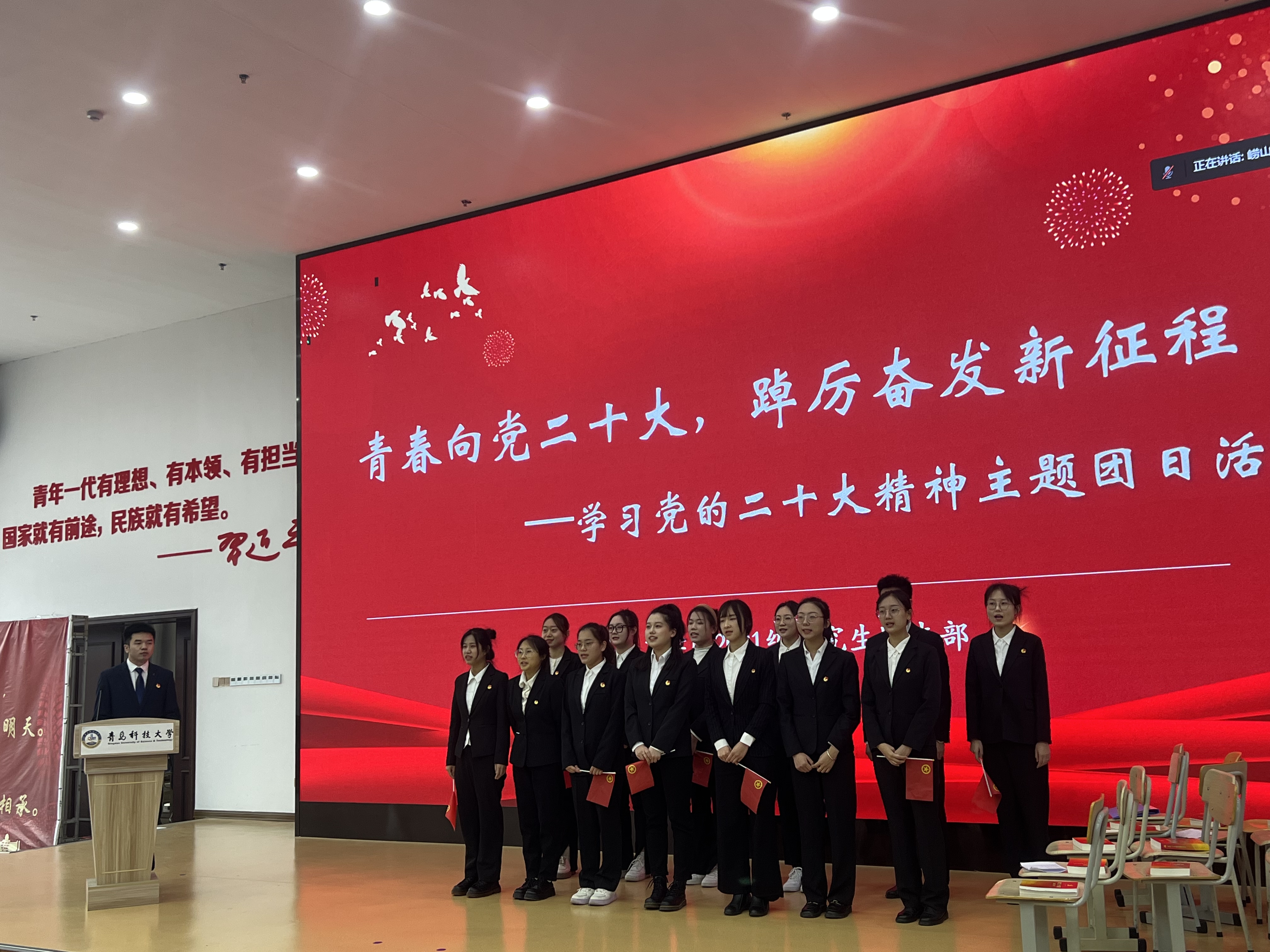 为深入学习贯彻党的二十大精神,引导团员青年坚定信念跟党走、携手奋进新征程,11月29日下午,2021级研究生团支部在北苑团学报告厅参加崂山校区卓越团支部主题团日活动展演。本次团日活动以“青春向党的二十大,踔厉奋发新征程”为主题,学院2021级研究生团支部副书记杨志国主持。