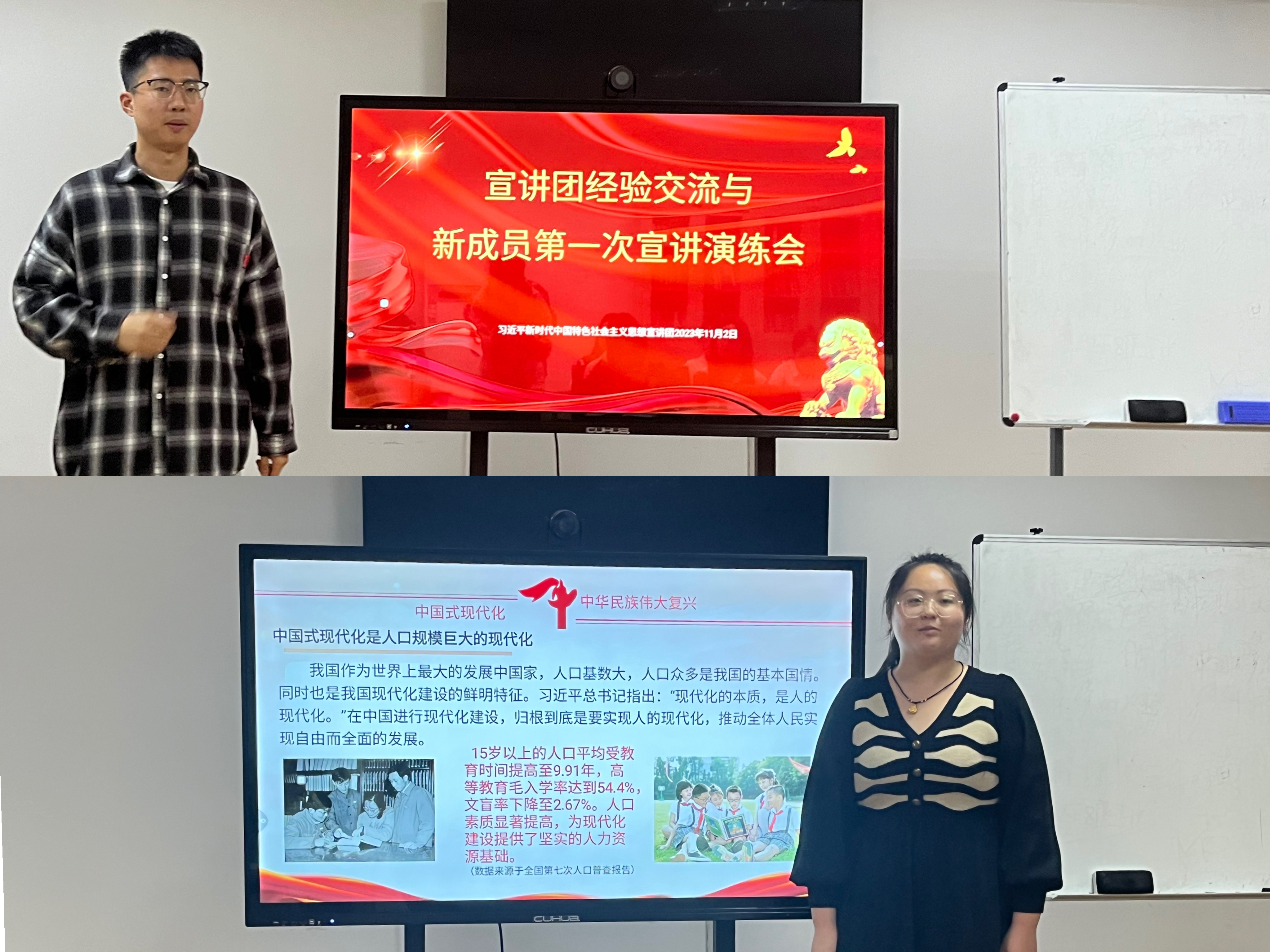 会议伊始,姜震向成员们分享了自己在宣讲团的成长与收获。他指出,理论宣讲是一项神圣且具有挑战性的工作,重任在肩更显荣光。随后,庞靖以中国式现代化的科学内涵为主题向成员们作宣讲示范。庞靖强调,马克思主义理论的宣讲者是灵魂与信仰的指路人,各位新成员要传播信仰,践行使命,为畅通党的创新理论传播的“最后一公里”注入青年力量。